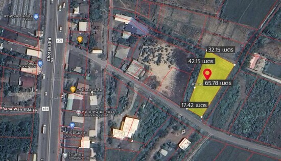 ขนาดที่ดิน: ความกว้างประมาณ 18 เมตร (ติดถนน) และด้านลึก (ยาว) 65 เมตร