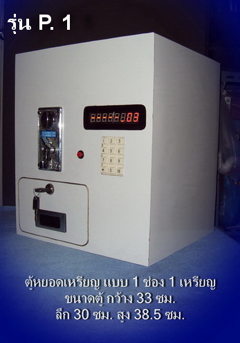 ตู้หยอดเหรียญ รุ่น P.1 ขนาดของตัวตู้ กว้าง 33 ซม. ลึก 30 ซม. สูง 68.5 ซม.