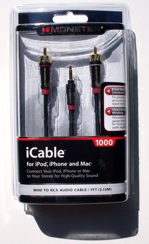 1. Monster iCable 1000 for iPod, iPhone and iPad ยาว 7ฟุต / 2.1เมตร 990. • 8-Cut Turbine RCA and Split-Tip center pin for better signal transfer • Mini-jack to RCA connection for connecting iPod, iPhone or iPad and home stereo. • 24K gold contacts for greater signal integrity • Time Correct Windings for more accurate audio reproduction • Dual Balanced conductors deliver more natural audio