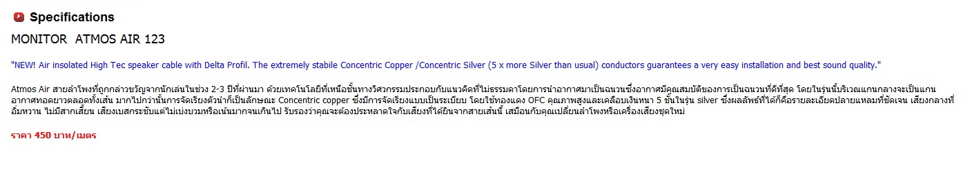 Atmos Air สายลำโพงที่ถูกกล่าวขวัญจากนักเล่นในช่วง 2-3 ปีที่ผ่านมา ด้วยเทคโนโลยีที่เหนือชั้นทางวิศวกรรมประกอบกับแนวคิดที่ไม่ธรรมดาโดยการนำอากาศมาเป็นฉนวนซึ่งอากาศมีคุณสมบัติของการเป็นฉนวนที่ดีที่สุด โดยในรุ่นนี้บริเวณแกนกลางจะเป็นแกนอากาศทอดยาวตลอดทั้งเส้น มากไปกว่านั้นการจัดเรียงตัวนำก็เป็นลักษณะ Concentric copper ซึ่งมีการจัดเรียงแบบเป็นระเบียบ โดยใช้ทองแดง OFC คุณภาพสูงและเคลือบเงินหนา 5 ชั้นในรุ่น silver ซึ่งผลลัพธ์ที่ได้ก็คือรายละเอียดปลายแหลมที่ชัดเจน เสียงกลางที่อิ่มหวาน ไม่มีสากเสี้ยน เสียงเบสกระชับแต่ไม่เบ่งบวมหรือเน้นมากจนเกินไป รับรองว่าคุณจะต้องประหลาดใจกับเสียงที่ได้ยินจากสายเส้นนี้ เสมือนกับคุณเปลี่ยนลำโพงหรือเครื่องเสียงชุดใหม่
