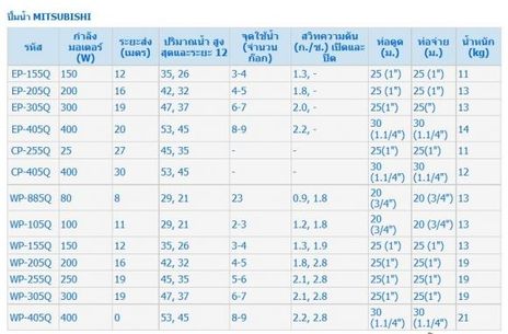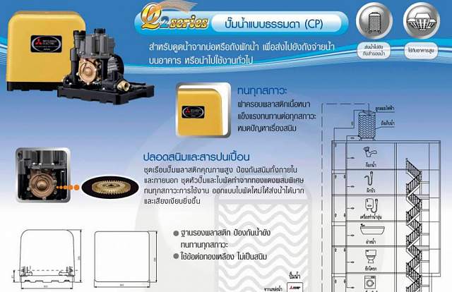 ต้องการขายปั๊มน้ำ MITSUBISHI รุ่น CP-255Q2 ขนาด250วัตต์"ของใหม่มีประกัน"ราคา4600 ติดต่อ 022512637 พรเทพ คุณสมบัติ # มอเตอร์พลังสูง ส่งกำลังน้ำได้แรง ทนทาน ออกแบบใหม่ปิดผนึกโดย Frame Aluminium มี Cooling Fan และ ครีบช่วยระบายความร้อน ปิดป้องกันสัตว์ หรือ แมลง เข้าไปในมอเตอร์ เสียงเดินเงียบยิ่งขึ้น เพิ่มแรงส่งน้ำได้ปริมาณมากขึ้น # มอเตอร์ รับประกัน 5 ปี # ชุดหัวปั๊มทำจากทองแดง ทำให้ทนทาน และ ไม่เป็นสนิม # มี Thermostat ป้องกัน Motor ไหม้ ในสภาวะที่ใช้งานผิดปกติ # ฝาถังเป็นพลาสติกชนิดพิเศษที่คงทน สีไม่จางไม่แตกร้าว กันแดด ฝน ทนทุกสภาวะ # ประเก็น กันรั่วชนิดพิเศษ ออกแบบอย่างปราณีต ทำจากเซรามิค จึงทนทานป้องกันน้ำรั่วซึมได้เป็นอย่างดี # ชุดเรือนปั๊มใช้เทคโนโลยีใหม่ โดยใช้พลาสติกคุณภาพสูง ลดจำนวนน๊อตยึด เพื่อลดโอกาสเกิดสนิมทั้งภายในและภายนอก # เพื่อให้มีความปลอดภัยในการใช้งาน จึงได้ติดตั้งอุปกรณ์ SAFETY VALVE เพื่อป้องกันไม่ให้แรงดันสูงเกินกว่ามาตรฐานที่กำหนดไว้ # เพิ่ม สายดิน เพื่อความปลอดภัยในการติดตั้งเครื่องเมื่อใช้งาน # กล่องเก็บสายไฟป้องกันน้ำเข้า ปลอดภัยในการเก็บ Condenser และสายไฟ โดยใช้วัสดุ VO. (ป้องกันการติดไฟ) # ได้รับการรับรองมาตรฐานระบบ ISO 9001:2000 และ ISO 14001 # ได้มาตรฐานการผลิต RoHS ของกลุ่มประเทศสหภาพยุโรป โดยใช้ชิ้นส่วนที่ไม่เป็นพิษต่อสิ่งแวดล้อม และสามารถนำกลับมาใช้ได้อีก # ได้มาตรฐานความปลอดภัยเหนือระดับ ( PREMIUM SAFETY ) เทคโนโลยีเฉพาะของมิตซูบิชิอีเล็คทริค