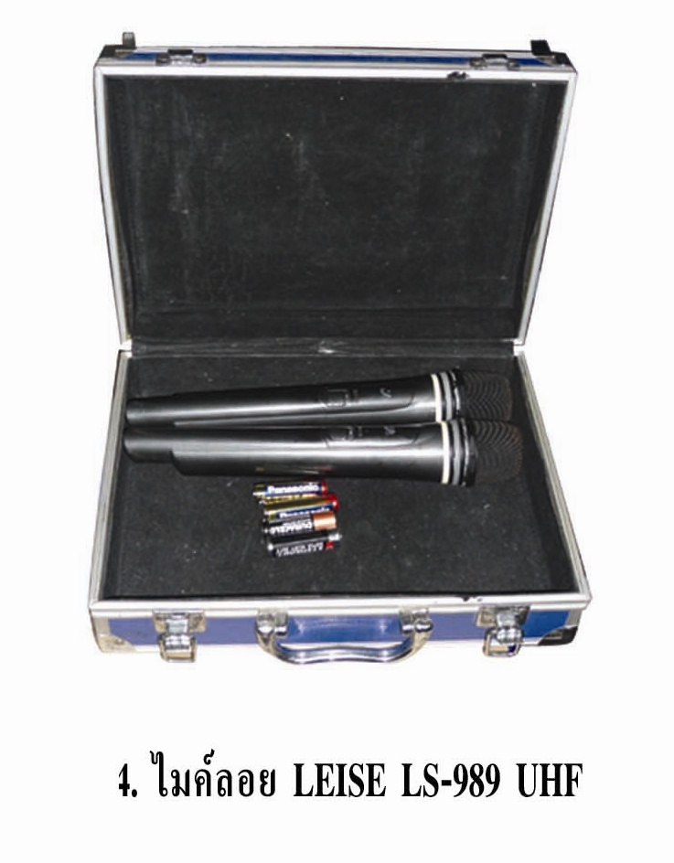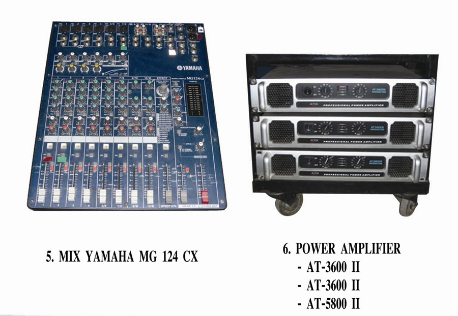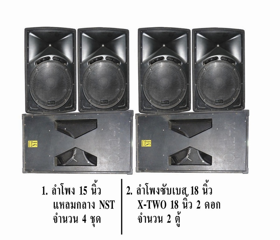 ประกอบด้วย 1. ลำโพง 15 นิ้ว แหลมกลาง NST จำนวน 4 ชุด 2. ลำโพงซับเบส 18 นิ้ว 2 ดอก จำนวน 2 ตู้ 3. ลำโพง 12 นิ้ว แหลมกลาง STS ใช้เป็น มอนิเตอร์ หน้าเวที 4. MIX YAMAHA MG 124 CX 5. POWER AMPLIFIER - AT-3600 II / AT-3600II / AT-3600 II 6. ตู้แร็ค ( RACK ) พร้อมล้อ ประกอบด้วย 6.1 ไมค์ลอย LEISE LS-989 UHF 6.2 COMPRESSOR PRO - XL (BEHRINGER) 6.3 CROSOVER CE- 234 XL (PROEURO TECH) 6.4 EQUALIZER T.231 TWEEQ 6.5 EQUALIZER GEQ - 215 MODIFY 6.6 MULTIPLE POWER MPR 402G NPE