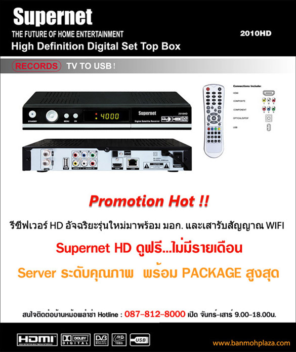 - Supernet รีซีฟเวอร์ HD อัจฉริยะรุ่นใหม่มาพร้อม มอก. และเสารับสัญญาณ WIFI Promotion ดูฟรี…ไม่มีรายเดือน Server ระดับคุณภาพพร้อม PACKAGE สูงสุด ฟรีสาย HD รับประกันตัวเครื่อง 1 ปี ฟรีค่าจัดส่งทั่วประเทศ ราคา 5,200 บาท