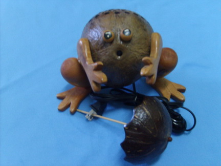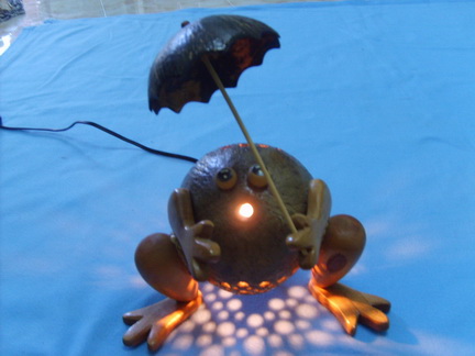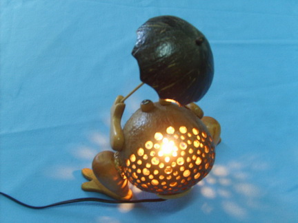 โคมไฟเป็นรูปกบทำมาจากกะลา มีหลอดไฟแสงสีสม มีสวิทซ์ปิดเปิด น้ำหนัก 500 กรัม น้ำหนัก : 500 กรัม ขนาด [กว้าง x ยาว x สูง] : 16 x 12 x 25 ซม.