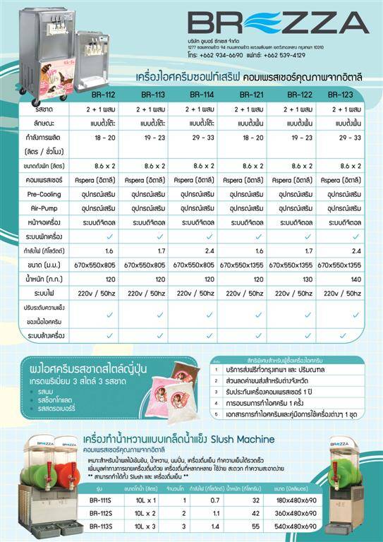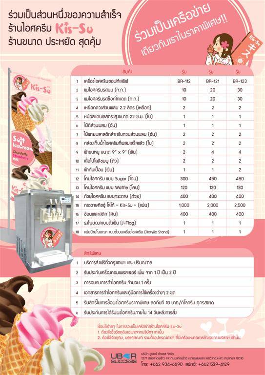 ขายเครื่องทำไอศครีมซอฟท์เสิร์ฟ, เครื่อง Slush Machine, ผงไอศครีมและแฟรนไชส์ไอศครีมKis-su จำหน่ายเครื่องทำไอศครีมซอฟท์เสิร์ฟ และ เครื่อง Slush Machine คอมเพรสเซอร์จากอิตาลี มีหลากหลายรุ่นให้คุณเลือก ใช้งานง่ายเสียบปลั๊ก แล้วปรุงไอศครีมรสที่คุณคิดขึ้นเอง หรือถ้าคุณยังไม่มีส่วนผสมของตนเองสามารถซื้อผงไอศครีมจากเราได้ ผงไอศครีม เรามีหลากหลายรสชาติที่อร่อยนุ่มลิ้นสดและหอมหวาน ตัวเครื่องทำจากสแตนเลสอย่างดีไร้สนิม ใช้งานง่าย ทนทาน สะดวกต่อการทำความสะอาดและเป็นมืออาชีพ มีบริการสอนการใช้งานของเครื่องเบื้องต้น ไอศครีม Kis-su แฟรนไชส์ ไอศครีมซอฟท์เสิร์ฟ ความอร่อยอินเทรนด์สุดๆ กับรูปแบบใหม่ของไอศครีม ที่เนียนนุ่มลิ้น สดและหอมอร่อย มีให้เลือกหลากหลาย รสชาติที่ถูกปาก ไอศครีมผลิตจากผลิตภัณฑ์นมสดแท้ ซึ่งให้ความสดหอมหวานตามธรรมชาติ เป็นธุรกิจที่เหมาะกับสภาพอากาศของบ้านเรา ด้วยการลงทุนที่ไม่สูงเกิน แต่ได้กำไรงาม และยังคืนทุนในระยะเวลาอันสั้น พร้อมบริการจัดส่งฟรีทั่วกรุงเทพและ ปริมลฑล