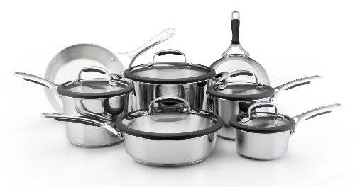 KitchenAid 75657 KitchenAid Gourmet Stainless Steel 12-Piece Cookware Set Includes: 1 Qt., 2 Qt. and 3 Qt. Covered Saucepans, 6 Qt. Covered Stockpot, 3 Qt. Covered Saute, 8-1/2-inch and 10-inch Skillets Stainless steel construction is favored by professional chefs for its durability and performance; Elegant windsor shapes look great and speed evaporation and sauce reductions. Dishwasher safe for convenience A thick aluminum core is at the base of this cookware for superior heating efficiency; It is fully encapsulated in stainless steel for durability and suitable for all stovetops including glass and induction This cookware features handles crafted of a combination of soft silicone and quality stainless steel. They look great, feel comfortable, and are double riveted for added strengthOven safe to 400°F Glass lids feature a unique silicone rim to create a tight seal and help lock in flavor and prevent rattling. Glass construction allows you to monitor the cooking progress without lifting the lid.