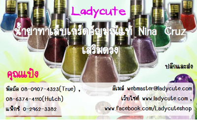 ทำไมต้องน้ำยาทาเล็บเกร็ดอัญมณีแท้ Nina Cruz รุ่นเสริมดวง น้ำยาทาเล็บเกร็ดอัญมณี Nina Cruz เสริมดวง อยู่บนพื้นฐานความเชื่อของคนไทยอย่างเราอยู่แล้ว น้ำยาทาเล็บเกร็ดอัญมณี Nina Cruz เสริมดวง มีราคาไม่แพง เมื่อเทียบกับการต้องหาซื้อชิ้นอัญมณีตามความเชื่อ น้ำยาทาเล็บเกร็ดอัญมณี Nina Cruz เสริมดวง ไม่สามารถใช้ร่วมกันได้ จึงทำให้มีปริมาณผู้ใช้มาก น้ำยาทาเล็บเกร็ดอัญมณี Nina Cruz เสริมดวง จำเป็นต้องทาใหม่ทุกวัน หรือ 2-3 วัน เพื่อให้พลังของอัญมณีมีอยู่อย่างต่อเนื่อง ซึ่งเป็นผลให้เมื่อถึงจุดหนึ่งจำเป็นต้องหาซื้อใหม่ น้ำยาทาเล็บเกร็ดอัญมณี Nina Cruz เสริมดวง มีคุณภาพเหนือกว่าที่มีตามท้องตลาด อีกทั้งด้วยรูปลักษณ์ของบรรจุภัณฑ์ และเกร็ดอัญมณีภายใน ทำให้น่าสะสม อีกทั้งยังใช้มอบเป็นของขวัญในโอกาสต่างๆได้อีกด้วย ทำไมต้องเป็น Ladycute.com Ladycute.com ไม่ มีการดัดแปลงหรือปรับเปลี่ยนบรรจุภัณฑ์ สินค้าของเราเป็น Original (ดั้งเดิม) เพราะเชื่อในเรื่องพลัง การปรับเปลี่ยนดัดแปลงอาจมีผลกับประสิทธิผลที่จะเกิดขึ้น Ladycute.com มีสินค้าตลอดเวลา เมื่อสินค้าตัวใดใกล้หมด เราจะเร่งนำเข้ามาทดแทน ไม่มีการนำของลอกเลียนแบบมาแทนไม่ว่าจากต่างประเทศเอง หรือในประเทศ Ladycute.com ยินดีให้คำปรึกษากับลูกค้าหรือตัวแทนจำหน่ายของ Ladycute.com ทุกท่าน 24 ชั่วโมง Ladycute.com มีการสนับสนุนในเรื่องของเอกสาร หรือข้อมูลให้กับตัวแทนจำหน่ายทุกท่าน
