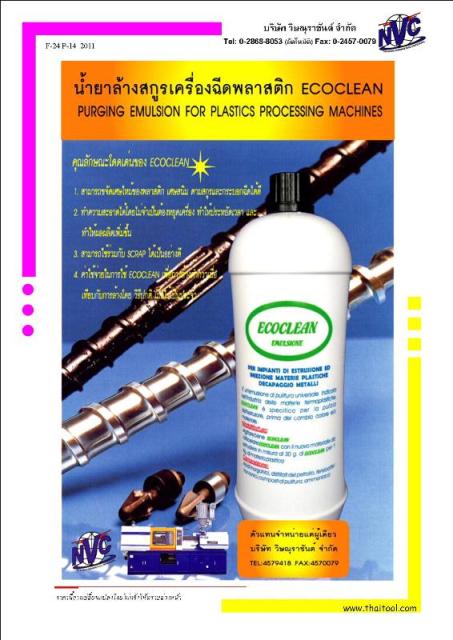 น้ำยาล้างสกรูเครื่องฉีดพลาสติก ECOCLEAN เป็นน้ำยาสำหรับทำความสะอาดแม่พิมพ์ สกรูเครื่องฉีด เครื่องหุ้มพลาสติก หรืออื่นๆที่มีลักษณะเดียวกัน โดยสามารถลอกเอาคราบสนิม คราบสี และสิ่งสกปรกออกจากเครื่องจักรได้อย่างหมดจรด คุณสมบัติ 1.สามารถขจัดเศษไหม้ของพลาสติก และเศษสนิมตามสกรูกระบอกฉีดได้ดี 2.ทำความสะอาดได้โดยไม่จำเป็นต้องหยุดเครื่อง ทำให้ประหยัดเวลา 3.สามารถใช้ร่วมกับเม็ดพลาสติกได้เป็นอย่างดี 4.ใช้เป็นประจำอย่างต่อเนื่อง จะช่วยประหยัดค่าใช้จ่ายเมื่อเทียบกับการล้างด้วยวิธีปกติ วิษณุราชันต์ เครื่องมือช่างมืออาชีพ