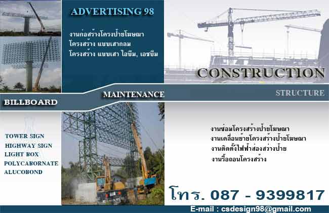 เขียนแบบ ออกแบบโครงสร้างป้ายโฆษณา ,ป้ายบิลบอร์ด ขนาดใหญ่ , แบบเสากลม , แบบ เสา WF / H-BEAM / I-BEAM / งานฐานรากคอนกรีต / รับม้วนท่อเหล็ก /เป็นที่ปรึกษา งานโครงสร้าง / ควบคุมงาน / ประเมินราคาค่าก่อสร้าง โทร. 087-9399817 e-mail :