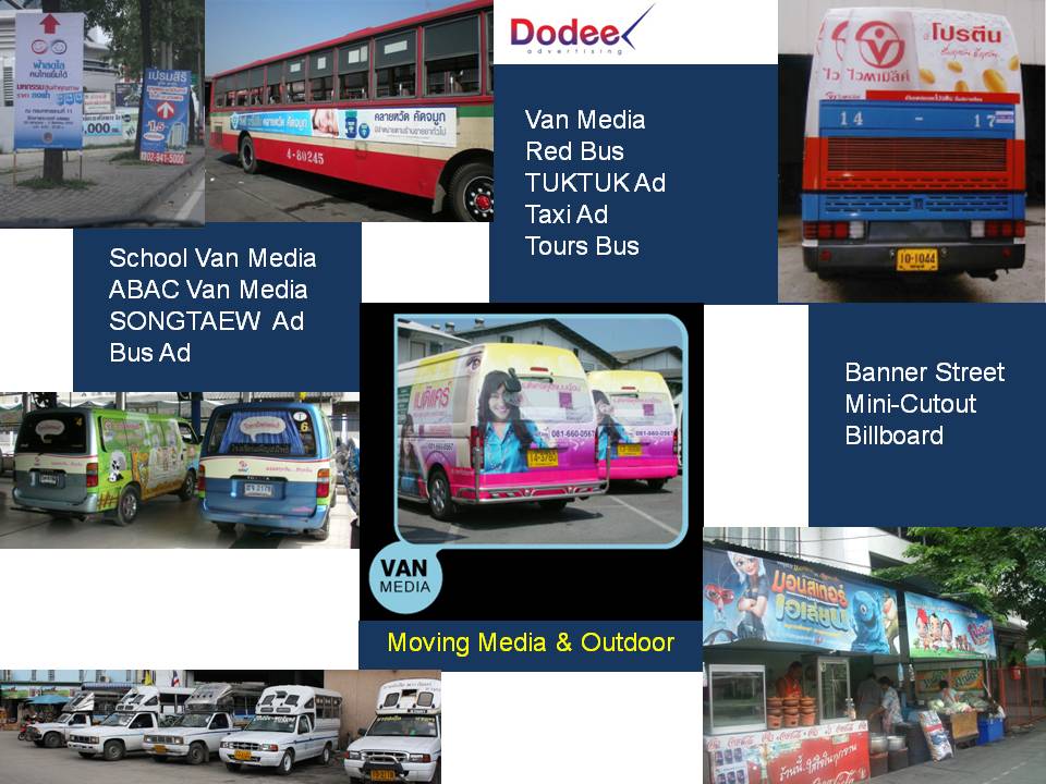 หากคุณต้องการการโฆษณาสินค้า และบริการ หรือประชาสัมพันธ์ข้อมูลข่าวสารด้วยสื่อนอกบ้าน หรือ Out of home media “สื่อเคลื่อนที่ " เป็นอีกทางเลือกที่น่าจับตามอง ด้วยลักษณะของสื่อ ที่เคลื่อนที่เข้าหาผู้คน วิ่งไปบนท้องถนนที่ผู้คนสัญจรวันละหลายๆ รอบ ย้ำเตือนการรับรู้สินค้าและบริการอย่างได้ผล ด้วยเส้นทางเดินรถที่หลากหลายที่วิ่งผ่านใจกลางเมือง โดยเฉพาะย่านธุรกิจ ตลาด แหล่งชุมชนที่ผู้คนอยู่อย่างหนาแน่น หรือแม้กระทั่งเส้นทางจากเมืองสู่จังหวัดต่างๆและรถที่วิ่งหัวเมืองใหญ่ทั่วประเทศทำให้การสื่อสาร มุ่งตรงสู่กลุ่มเป้าหมายที่ครอบคลุม สร้างความแตกต่างจากงบประมาณที่มีอยู่ด้วยราคาเบาๆ ทำให้กิจกรรมทางการตลาดของคุณขับเคลื่อนไปไม่หยุดนิ่ง... บริษัท ดูดี แอดเวอร์ไทซิ่ง จำกัด ให้บริการสื่อโฆษณาเคลื่อนที่ ด้วยประสบการณ์กว่า 15 ปีในสายงานผลิต และติดตั้งตลอดจนประสานงานสื่อ ทำให้ตอบสนองความต้องการของลูกค้าและได้รับความไว้วางใจอย่างยาวนาน และยินดีให้คำปรึกษาตลอดจนดูแลเรื่องงบประมาณ ให้ทุกเม็ดเงินคุ้มค่าสำหรับคุณ ติดต่อ คุณ พงศกร ( 085-1900-882 ) office ( 0-2974-5646 ) http://www.dodeead.com