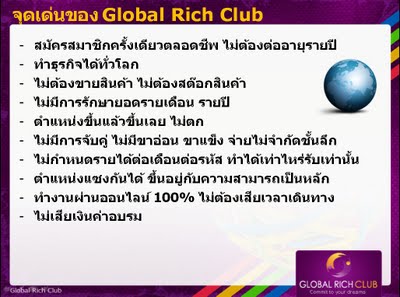 ธุรกิจออนไลน์ Global Rich Club (GRC) เป็นธุรกิจเกี่ยวกับการท่องเที่ยว แผนการตลาดแนวใหม่ ฉีกกฎเครือข่ายแบบเดิมๆ ทำงานออนไลน์ 100 % ทำจากที่บ้านหรือที่ไหนๆที่มีเนต ไม่ขายของ ไม่สต็อกสินค้า ไม่มีการรักษายอดทั้งสิ้น สอนงานฟรี ทางออนไลน์ ไม่เก่ง ทำได้ทุกคน เพราะ แม่บ้านธรรมดา สร้าง รายได้มาแล้ว 1 ล้านบาทภายใน 5 เดือน แค่เปิดโอกาส ลองศึกษา ฟรี ....ง่าย ระบบเราช่วยทำงานทุกขั้นตอน อ่านข้อมูลเพิ่ม กด www.grcyoyo.com
