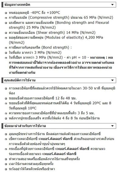 ต้องการขาย Weber Color Poxy เวเบอร์.คัลเลอร์ พ๊อกซี่ราคาชุดละ2180.- (ชุดละ5kg)เป็นกาวEPOXYเหลวสำหรับยาแนวที่ต้องการความทนทาน ติดต่อ022512637 พรเทพ ส่วนประกอบ * ส่วนประกอบที่สำคัญ คือ อีพ๊อกซี่เรซิ่น ตัวเร่งปฏิกิริยา สารปรุงแต่ง ข้อมูลทางเทคนิค * ทนต่ออุณหภูมิ -40ºC ถึง +100ºC * การรับแรงอัด (Compressive strength) ประมาณ 65 MPa (N/mm2) * แรงยึดเกาะ และความแข็งแรงดัด (Bonding strength and Flexural strength) 25 MPa (N/mm2) * ความแข็งแรงเฉือน (Shear strength) 14 MPa (N/mm2) * มอดูลัสของความยืดหยุ่น (Modulas of elasticity) 4,200 MPa (N/mm2) * การยึดเกาะกับคอนกรีต (Bond strength) : * ในที่แห้ง มากกว่า 3 MPa (N/mm2) * ในที่เปียก มากกว่า 3 MPa (N/mm2) - ค่า pH = 10 - หมายเหตุ : ผลการทดสอบเหล่านี้ได้มาจากห้องทดลองตัวอย่าง อาจจะแตกต่างกับผลที่ได้จากการผสมที่หน่วยงาน เนื่องจากวิธีการใช้และสภาพของหน่วยงานที่แตกต่างกัน คุณสมบัติการใช้งาน * กาวเหลวอีพ๊อกซี่ที่ผสมแล้วควรใช้ให้หมดภายในเวลา 30-50 นาที ที่อุณหภูมิห้อง * ระยะแข็งตัวของกาวเหลวอีพ๊อกซี่ 12 ถึง 48 ชม. * ระยะแข็งตัวที่ดีที่สุดและทนต่อสารเคมีได้คือ 4 วันที่อุณหภูมิ 20ºC และ 8 วันที่อุณหภูมิ 10ºC * ความหนาของกาวเหลวอีพ๊อกซี่ที่ปาดลงบนพื้นผิว 3 ถึง 5 มม. * หลังจากปูกระเบื้องเสร็จ ควรทิ้งให้แห้ง 4 ถึง 8 วัน ก่อนเปิดใช้งาน