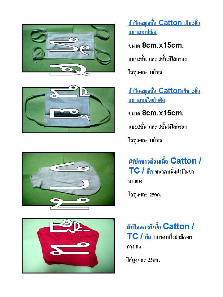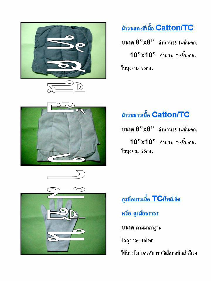 ขายผ้าวน 8นิ้ว และ 10นิ้ว ผ้าวนเล็ก และ ผ้าปึกขาว และ ผ้าปิดจมูก และ ผ้าเช็ดเครื่องจักร ทุกชนิด ขายเศษผ้าวน 8นิ้ว และ 10นิ้ว ผ้าวนเล็ก และ ผ้าปึกขาว และ ผ้าปิดจมูก และ ผ้าเช็ดเครื่องจักร ทุกชนิด ขายผ้าวน 8"x8" แบบบาง 13-16 ชิ้น/โล และ 10"x10" 8-9 ชิ้น/โล 1 ผ้าวนสีขนาด 10นิ้วx10นิ้ว (ประมาณ 6-7 ผืน/กก.) ราคา18 บาท 1.1 ผ้าวนสีขนาด 8"x8 " (ประมาณ 13-16ผืน/กก.) 2 ผ้าวนขาวขนาด 10"x10"(ประมาณ 7-8 ผืน/กก.) ราคา 35บาท 2 ผ้าวนขาวขนาด 8"x8" (ประมาณ 13-15 ผืน/กก.) 3 หัวผ้าสี ขากาง /1/2 ถึง A4 (ผ้าค็อตตอนเนื้อเรียบ) 4 หัวผ้าขาวหนึ่งฝามือ (ผ้าค็อตตอนเนื้อเรียบ) 5. ผ้าปิดจมูก 2 ชั้น (ไส้ผ้ายืด Cotton หนา 2 ชั้น 6.ถุงมือ TC ขาว หรือถุงมือจราจร ราคา 66บาท/โหล. 7.ผ้าขาวขนาด A4 ราคาต่อรองกันได้ ปกรณ์ 0840079522 ทัศนีย์ 0878023814