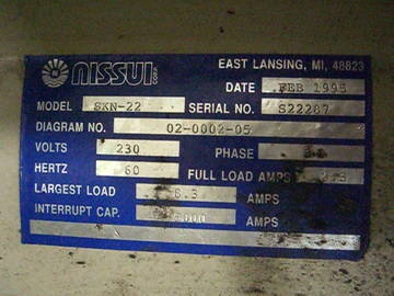 Cutter Nissui (USA), 208-230V, 2.2Kw, s/n S22287, Diagram No: 02-0002-05, full load amp 8.3, 3P, 60Hz, ebay listing 330457521321, space size 1x1x2m, 1Ton