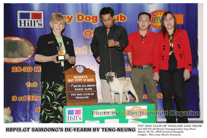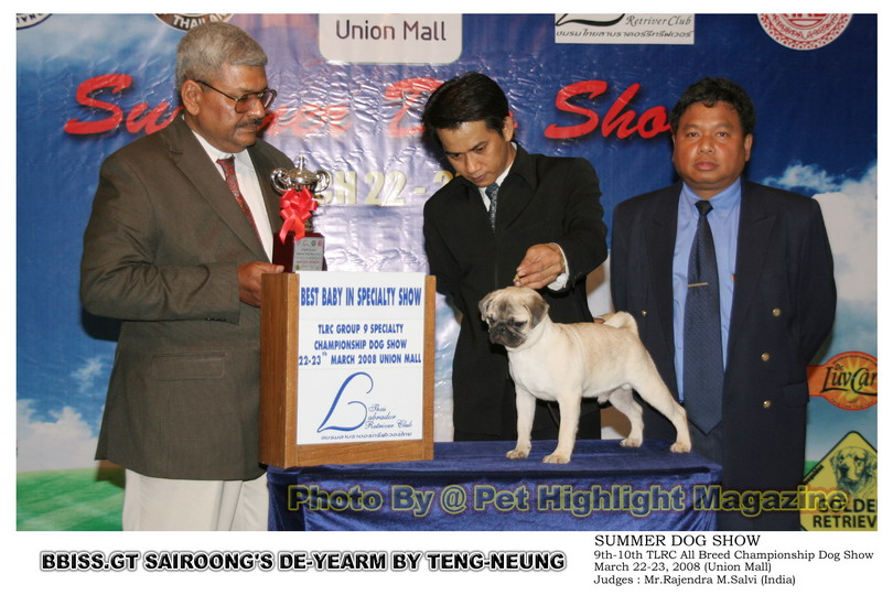 TH.CH.GT SAIROONG'S DE-YEARM BY TENG-NEUNG "มันนี่" ผลประกวดงานแรกของมันนี่ วันที่ 22 มี.ค. 51 ลงประกวดในรุ่น BABY (3-6 เดือน) "มันนี่" ได้ตำแหน่ง BEST BABY IN SHOW (คือตำแหน่งสูงสุดในรุ่น BABY) วันต่อมา 23 มี.ค. 51 "มันนี่" อายุ 6 เดือน 1 วัน ลงประกวดในรุ่น PUPPY "มันนี่" ก็ได้ตำแหน่ง BEST PUPPY IN SHOW (ตำแหน่งสูงสุดในรุ่น PUPPY), BEST WINNER และได้ CC แรกในวันนั้นด้วย "มีสุนัขน้อยตัวจริงๆที่จะได้รางวัลในตำแหน่งสูงๆมากมายแบบนี้ด้วยอายุเพียง 6 เดือน 1 วัน" ...จบไทยแชมป์แล้ว วันที่ 19 ก.ค.51 ... ด้วยอายุเพียง 9 เดือนเศษ สำหรับท่านเจ้าของแม่พันธุ์ปั๊กที่ต้องการให้ลูกปั๊กมีคุณภาพสวย ริงเกิ้ลเต็ม ตัวอ้วนสั้น และมีสายเลือดดี ติดต่อสอบถาม, ติดต่อจองผสมพันธุ์ได้ที่ คุณเกี้ย โทร. 081-7825123 , 088-3448899