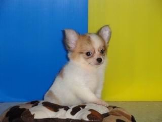 ลูกสุนัข " ชิวาว่า ขนยาว " ชุดใหม่ เพศผู้ สี ขาว + น้ำตาล ราคา 7,900 บาท