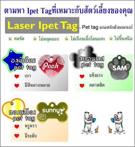 ยินดีต้อนรับสู่สังคม iPet Tag จี้ห้อยคอสัตว์เลี้ยง“iPet Tag” นั้นสร้างความแตกต่างให้กับสัตว์เลี้ยงของคุณ ผ่านทางการ CusToMize จี้ห้อยคออลูมิเนียมแบบพิเศษที่มีความสวยงาม บวกกับความแข็งแรงที่มาพร้อมกับน้ำหนักที่เบา โดยภาพที่ถูก customized บนจี้นั้นจะไม่มีการเลือนหาย เมื่อโดนแสง ไม่มีการขึ้นสนิมเมื่อโดนน้ำ มีความติดแน่นทนนาน เนื่องจากเราใช้เทคโนโลยีเลเซอร์ใหม่ล่าสุด ยิงไปบนผิวงานโดยตรง ทำให้ได้ภาพที่คมกริบ มีรายละเอียดสูง และติดทนถาวร