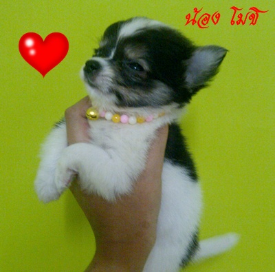 ชิวาวาขนยาว เพศผู้ อายุ 2 เดือนกว่าๆ สีขาวดำ ลายจุดดำสวยมาก มาร์คกิ้งดำแซกขาวน่ารักมากๆ
