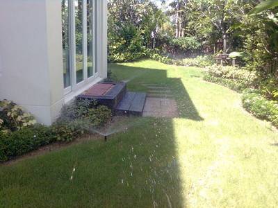 ระบบสปริงเกอร์ รวมท่อ สาย หัวฉีดสปริงเกอร์ผมใช้เป็นหัว ยี่ห้อ HUNTER และ RAINBIRD ซึ่งเป็นหัวของอเมริกา ที่มีข้อดีคือ ทนทาน การกระจายน้ำดี และไม่ขวางทางเดินหรือเกะกะสนามเมื่อเวลาทำเสร็จแทบจะไม่เห็นหัวสปริงเกอร์เลย เพราะว่าหัวชนิดที่ผมใช้จะฝังอยู่ใต้ดินเวลาได้รับแรงดันน้ำจึงค่อยโผล่ออกมาผมจะเรียกมันว่า หัว popup ส่วนในไม้พุ่มและไม้คลุมดิน ผมจะลากสายน้ำเข้าไปในพุ่มแล้วใส่หัวสเปรย์ ดังนั้นเมื่อมีการปลูกไม้เพิ่มเราสามารถที่จะเจาะแล้วเสียบหัวสเปรย์ได้เลย ส่วนปั้มน้ำถ้าเป็นบ้านเดี่ยว 50-70 ตรว.ผมมักใช้ปั้มหอยโข่งขนาด 1 แรงม้า ของ อิตาลี (ยี่ห้อ EBARA) หรือบางบ้านลูกค้าไม่ต้องการใช้ปั้มหอยโข่ง(เพราะส่วนใหญ่ทุกบ้านจะมีปั้มอัตโนมัติอยู่แล้ว) ผมก็จะใช้ใช้ปั้มอัตโนมัติแต่ปั้มพวกนี้มีแรงดันตลอดเวลาและสปริงเกอร์เป็นระบบเปิด ดังนั้น เราก็จะต้องใช้วาล์วไฟฟ้าเป็นตัวปิดน้ำกรณีที่เราทำเป็นอัตโนมัติแต่ถ้าเป็นระบบ manual ก็ไม่ต้องใช้ จากที่กล่าวมานี้ราคาเริ่มต้นเพียง 15000 บาท รวมปั้มและอุปกรณ์ทั้งหมด สำหรับระบบ manual สามารถใช้งานได้เลย ไม่ต้องเสียเวลารดน้ำ แต่ถ้าต้องการให้ปิดเปิดเองอัตโนมัติ เพิ่มกล่องควบคุมโดยระบบดิจิตอลมีตัวป้องกันกระแสเกินและตัวป้องกันไฟกระชาก ราคา 2500 บาทพร้อมติดตั้งให้เรียบร้อยกรณีเป็นเปิดจังหวะเดียว รวมเป็นราคาเริ่มต้นที่ 17500 บาท ส่วนกรณีที่บ้านมีหลายส่วนทางผมจะตั้งระบบให้ทำงานแบ่งเป็นโซนชุดควบคุมก็จะเป็นแบบเปิดเป็นโซนชุดควบคุมแบบนี้ทางเราขายอยู่ที่ชุดละ 5500 บาท รับประกัน ตู้ควบคุม 1 ปีทุกกรณี รวมพร้อมติดตั้งแต่เราก็ต้องมีวาล์วไฟฟ้าเพิ่มขึ้นมาเท่ากับจำนวนโซนที่เปิดนะครับ ทีมงานผมทำงานเป็นกันเอง มีความรับผิดชอบงานและบริการหลังการขายเป็นเยี่ยม จนลูกค้าหลายรายที่ใช้บริการของเราให้ความไว้วางใจแนะนำลูกค้าต่อเนื่องให้เรา ซึ่งต้องขอขอบคุณท่านเหล่านั้นไว้ ณ ที่นี้ด้วยครับ กรณีที่ท่านมีระบบสปริงเกอร์อยู่แล้วและต้องการให้สามารถเปิดเองได้อัตโนมัติทางผมรับทำและติดตั้งเฉพาะชุดควบคุมให้เป็นระบบอัตโนมัติด้วยครับ นอกจากนี้ ทางทีมงานรับปรึกษา แก้ไขและซ่อมระบบสปริงเกอร์อัตโนมัติเก่าที่เสียหายชำรุดทุกระบบ พร้อมรับสั่งทำและติดตั้งชุดควบคุมสปริงเกอร์ที่มีความซับซ้อนเฉพาะงานพิเศษด้วยครับ ส่วนราคาแล้วแต่ว่าความยากง่ายในการเขียนโปรแกรมของงานนะครับ ก่อนรับงานทางทีมงานจะวัดพื้นที่พร้อมประเมินราคาให้ทราบก่อน และบอก scope งานว่าใช้กี่ ZONE และจุดที่ต้องใส่หัวสปริงเกอร์ พร้อมเขียนแบบ