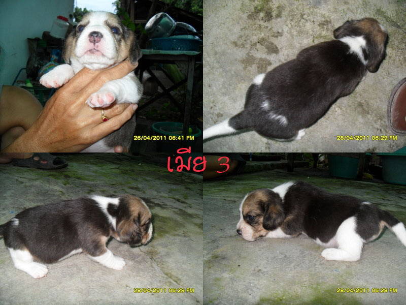 มีลูกสุนัขสายพันธุ์บีเกิ้ล ตัวเมีย 3 ตัว ตัวในรูป พันธุ์แท้ครับ ลูกสุนัขเกิดวันที่ 9 เมษายน 2554 สีสวย สีเข้ม ขนสามสี มีหน้ากากแซกหน้าทุกตัว มีสร้อยคอ รูปถ่ายปัจจุบันครับ เปิดให้จองไว้ก่อนครับ ลูกสุนัขแข็งแรงดีมากครับอ้วนจ้ำม่ำ ขายราคาตัวละ 5,500 บาท รับลูกสุนัขได้ตอนอายุครบ 45 วันพร้อมฉีดวัคซีนรวม ให้ 1 เข็ม สนใจโทรสอบถามรายละเอียดได้ครับที่เบอร์ 089-9535127...สมพันธ์ (ต่างจังหวัดบริการส่งทางเครื่องบินครับ ทางคาร์โก้สายการบินไทย ค่าขนส่ง + กรงใหม่ 1 ใบ ประมาณ 600 บาท ผู้ซื้อต้องออกเองนะครับ) ดูรูปเพิ่มเติมที่ Link Web