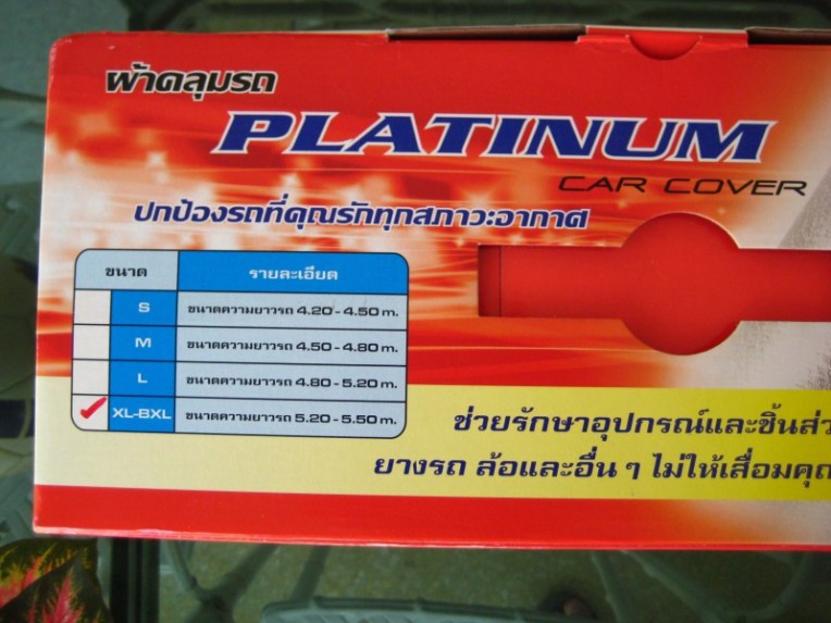 ผ้าคลุมรถ Platinum Car Cover สำหรับรถที่มีความยาว 5.2 - 5.5 เมตร เหมาะสำหรับรถกระบะ รถอเนกประสงค์ หรือรถเก๋งขนาดใหญ่ ตัดใจขายขาดทุน ซื้อมาตอนน้ำท่วม แต่ไม่ได้ใช้เลยค่ะ สนใจติดต่อ คุณฟ้า 086-8811155