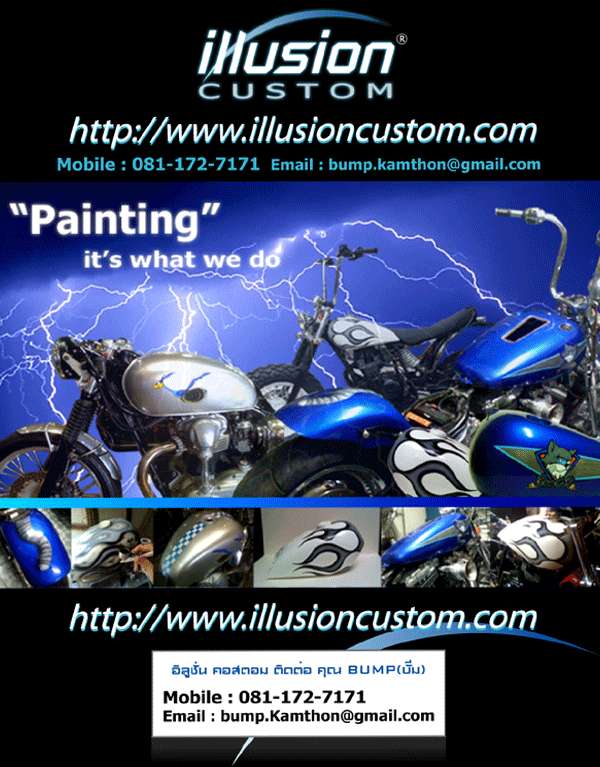 Illusion-custom บริการ เปลี่ยน เพนท์ ลาย สีถังน้ำมัน ชิ้นส่วนต่าง ๆ มอเตอร์ไซค์จักรยาน รวม ถึง ล้อแมค รถยนตร์ ตาม Concept ในแบบที่ คุณต้องการ รวมไปถึง บริการ เคาะ ปะ ผุ ขึ้นรุป แต่งทรง ตัวถัง ไม่ว่าจะเป็น ชิ้นงาน เหล็ก ไฟเบอร์กลาส และ พลาสติก ก็สามารถทำได้ " รับ PAINT ทำสีงานขนาดเล็ก และ กลางทุกประเภท " http://www.illusioncustom.com [email protected] Bump 081-172-7171