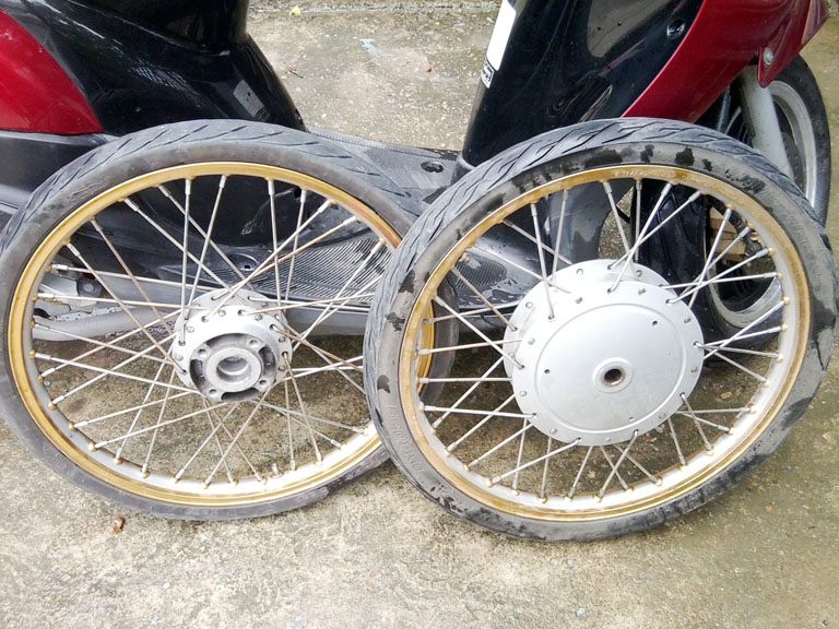 ขายล้อ+ดุม fino สภาพสวย ยางใหม่ทั้งคู่ เปลี่ยนมาใส่ล้อโตแหละครับบบบบบบบ