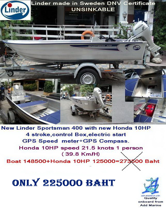 เรืออลูมิเนียมใหม่จากสวีเดนรุ่น Sportsman 400ราคา 148,500 บาท พร้อมด้วยป้อมคอนโทรล พวงมาลัยพร้อมสาย (6,000 บาท) เกจจ์วัดความเร็วแบบใช้จีพีเอสจับแม่นยำที่สุดพร้อมเกจจ์วัดแบตเตอรี่ (6,500 บาท) ปั้มน้ำ พร้อมสวิตย์ออโต้ (1,300 บาท) ถังน้ำมัน25 ลิตรพร้อมสายลูกบีบครบ (2,700 บาท) เครื่องฮอนด้ามารีนใหม่ 4 จังหวะ 10 แรงม้า ประหยัดน้ำมัน มากๆๆ พร้อมด้วยชุดคอนโทรลและสวิตย์กุญแจสตาร์ตไฟฟ้า ราคา 125,000 บาท โปรโมชันพิเศษโปรโมทเรือใหม่จากสวีเดน จากราคารวมกว่าสามแสนบาท ลดราคาเหลือ 225,000 บาท พร้อมรับประกันเรือ 3 ปี เรือพร้อมลงน้ำวิ่งได้ทันที หรือถ้าท่านกลัวเรือไม่แรงดังใจ เราสามารถเปลี่ยนเครื่องเรือเป็นเครื่อง 2 จังหวะใหม่ขนาด 30 แรงม้าจากอิตารี่ ยีฮ้อ Selva พร้อมรับประกันเครื่อง 1 ปี และอะไหล่ภายใน 48 ชั่วโมง พร้อมเครื่องให้ยืมในกรณีเครื่องต้องทำการซ่อมบำรุงหนัก ในราคาที่เท่ากัน ติดต่อ โต๊ะ 0852262288