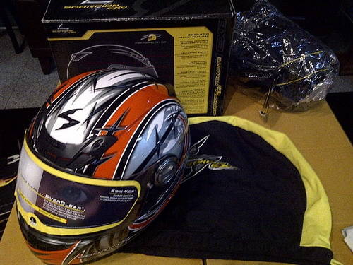 4. หมวก Scorpion รุ่น Exo-400 (สีส้ม ลาย sting สุดเท่ย์) ขนาดปรับได้ระหว่าง L และ XL ราคา 5,000 บาท