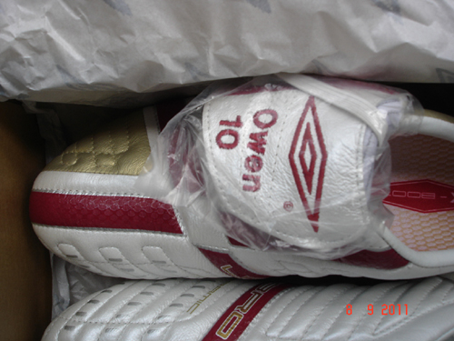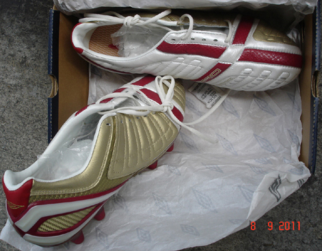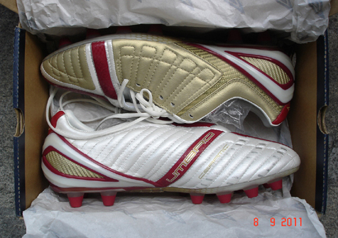 UMBRO X-BOOT 2 ที่ลิ้นมีปักชื่อ Owen หนังจิงโจ้แท้ สีทอง-ขาว-แดง + ผ้าลายเคฟล่าแท้ ตามรูป เบอร์ 8 uk / 265 jp / 9 us ของใหม่ พร้อมกล่อง ของแท้ 100 % ตามรูป สนใจโทร 089-121-9003 วรพจน์ เวลา 8.30 - 23.00 น.อย่างเดียวเท่านั้น