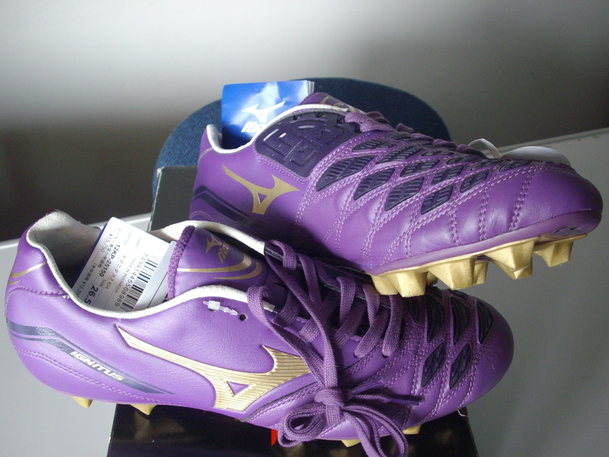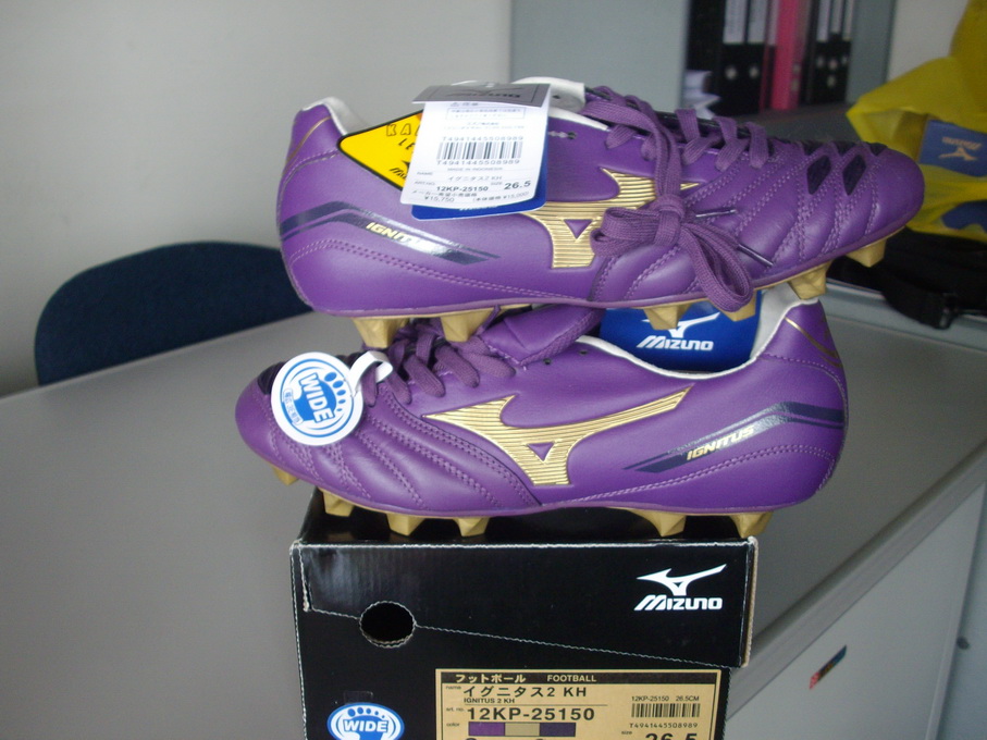 Mizuno Wave Ignitus II KH สีม่วง/ทอง เบอร์ 26.5หนังจิงโจ้แท้100% ตัวท็อป ปุ่มใบมีด น้ำหนักโดยประมาณ249.0 กรัม จากราคา7,990 บาท ขายเพียง 5,900 บาท เป็นรองเท้าที่กำลังนิยมอย่างมาก นักเตะที่ใช้คือ Keisuke Honda ศูนย์หน้าทีมชาติญี่ปุ่นและดาราเจลีคอีกมากมาย