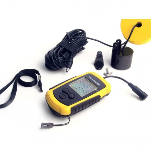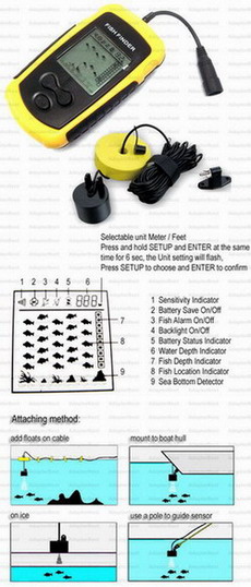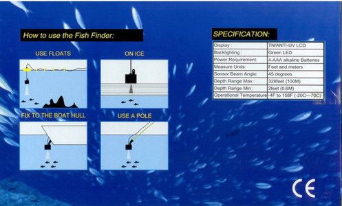 หาตำแหน่งโดยประมาณของปลา และความลึกของน้ำ หัวส่งคลื่นมุม 45 องศา พร้อมสายไฟต่อหัวส่งคลื่น ยาว 7.5 เมตร จอ LCD มี LED เป็นแสงสว่างใช้ดูจอตอนกลางคืน ตำแหน่งของปลาแสดงความลึกโดยใช้สเกล และมีเสียงสัญญาณเตือนเมื่อเจอปลา วัดความลึกได้ตั้งแต่ 0.7 เมตร ถึง 100 เมตร แสดง ก้อนหิน ปะการัง และ พืชใต้น้ำ ที่ก้นน้ำ อุณหภูมิใช้งาน -20 องศา C ถึง 70 องศา C ใช้แบตเตอร์ขนาด AAA จำนวน 4 ก้อน อุปกรณ์ที่ให้ เครื่อง Fish Finder หัวส่งคลื่นมุม 45 องศา (Round Sonar Sensor )พร้อมสายยาว 7.5 เมตร Bolt , หางปลา สเตนเลส ใช้ยึดหัวส่งคลื่นติดกับเรือ สายคล้อง คู่มือภาษาอังกฤษ