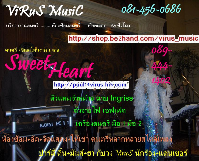 งานวิวาห์ (วง Sweet Heart) + งานปาร์ตี้ สังสรร (วง ไวรัส) +ให้เช่าเครื่อง + ห้องซ้อมดนตรีTel. 081-456-0686 ณ ไวรัสมิวสิค บันเทิง