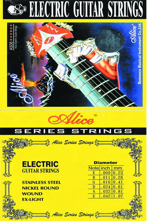 สายกีตาร์ไฟฟ้า Alice ราคา 120 ขนาด .09- .42, ทำด้วยสายโลหะอย่างดี, ให้การตอบสนองเสียงได้ดี