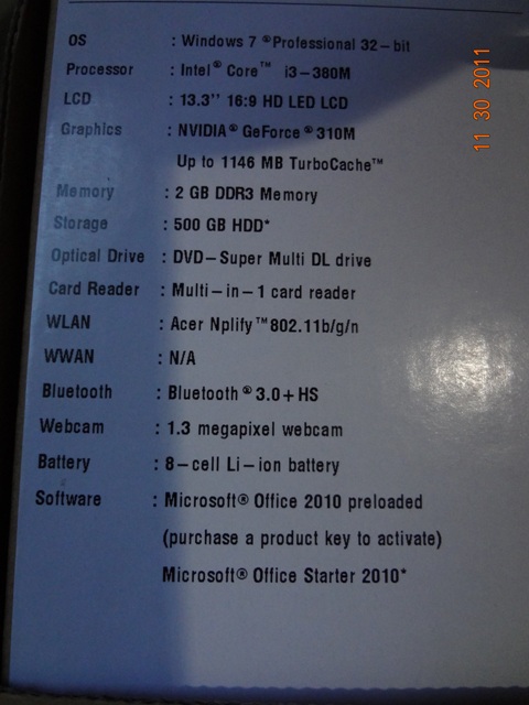ขายถูกnotebook ACER Travelmate TimelineX 8372TG-382G50Mnkk สเปกแรงๆ (core i3,ram 2G,Harddisk 500GB,NVIDIA GeForce 310M,Windows7 Professionalพร้อมประกัน3ปี) แบตเตอรี่ใช้ได้นานกว่า8ชั่วโมง***อุปกรณ์ครบยกกล่องพร้อมกระเป๋า Acer แท้ สภาพเหมือนใหม่100% มีประกันศูนย์3ปีถึงเดือน 08ปี2014*** ขาย14,900บาทเท่านั้น สนใจติดต่อ ไมค์ 081-4138971 SPECIFICATION OS : Windows7 Professional 32bit Processor : Intel Core i3-380M (2.53GHz) LCD : 13.3" 16:9 HD LED LCD Harddisk : 500GB HDD Optical Drive : DVD-Super Multi Graphics : NVIDIA GeForce 310M (1146MB) Ram : 2GB DDR3 Battery : 8 Cell Li-Ion