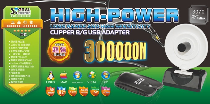 - Signal King USB Wifi High Power 1500mW (chip RTL8187L) รุ่น 56G มาพร้อมกับเสาแบบทิศทางขนาด 10 dBi (สามารถเปลี่ยนเสาได้) ในชุดจะมี ตัวรับสัญญาณ , เสา , สาย USB , แผ่นไดว์เวอร์ ราคา 890 บาท ( ถ้าต้องการให้ส่ง EMS + 60 บาท ) สำหรับท่านที่ใช้ Signal King ที่ใช้ chip RTL8187L สามารถโหลด Driver ล่าสุดได้ที่ http://www.mediafire.com/?l44vx39ftagkk3k