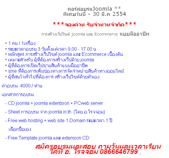 อบรม จูมลา การสร้างเว็ปไซต์ ด้วย จูมลา ทั้ง จูมลาเบื้องต้น Joomla Basic จูมลาชั้นสูง Joomla Advance สอนตัวต่อตัว หรือ แบบกลุ่ม และ บริการสร้าง เว็ปไซต์ Website ด้วย จูมลา และ จูมลา อีคอมเมิรซ์ Joomla ecommerce สอนแบบ Work Flow บริการสอน และอบรมการสร้างเว็ปไซต์ ด้วย จูมลา ทั้ง จูมลาเบื้องต้น (Joomla Basic), จูมลาชั้นสูง (Joomla Advance) และ การบริหารเว็ปไซต์ด้วย Joomla CMS การสร้าง web ecommerce ด้วยตัวเอง แบบ สอนแบบ Work Flow หลักสูตรการอบรม 1. หลักสูตรการสร้างและการบริหารเว็ปไซต์ด้วย joomla CMS 2. หลักสูตรการสร้าง web ecommerce ด้วยตัวเอง แบบ worlk-flow 3. สอนการบริหาร จัดการ การขายสินค้า บนเว็ปไซต์ ด้วย Joomla eCommerce solutions พร้อมแนะนำ vendor เพื่อส่งสินค้า http://www.joomla.in.th/v1.15e/index.php?option=com_content & task=view&id=1&Itemid=31 4. หลักสูตร การบริหารจัดการเว็ปโฮ้บติ้งและธุรกิจโดเมนเนม รับลงทะเบียน 1-6 คน /ครั้ง (พิเศษ เรียนตัวต่อตัว) เนื้อหาหลักสูตรการอบรม จูมล่า เบื้องต้น - การติดตั้ง PC Web servers ( PHP,Web servers,mysql) / มีแบบ one-clik install - การติดตั้ง joomla - การ Config Database และการตั้งค่าต่างๆ - การใช้งาน Admin Control Panel - เรียนรู้โครงสร้างของ joomla, และการจัดการเว็ปไซต์ ด้วย function ภายใน - การ ออกแบบหน้าเว็ป ,เนื้อหา ตามความต้องการ และการเลือกใช้ layout และการแก้ไขประยุกต์ใช้งาน - การใช้งานและการติดตั้ง Module,companet,Mambot, และอื่นๆ - การจัดการกับ Template และการใช้ Template resource - การเลือกใช้ module,companel,mambot และการประยุกต์ใช้งาน - การติดตั้ง ระบบ eCommerce solution - การ Backup และการ Restore - เทคนิดต่างๆในการใช้งาน .. สนใจดูรายละเอียด หรือลงทะเบียนได้ที่ http://www.joomla.in.th หรือสอบถามข้อมูลเพิ่มเติมได้ที่ คุณโรจจอม แจ่มศรี โทร สนใจติด ต่อได้ที่ 086-0302525 084-6819777 086-6646799 02-2466762 02-2464645 08-9497-1647 (DTAC) พร้อมให้คำแนะนำ..ปรึกษา -------- Other Servcies ------- บริการโดเมนเนมและโฮสติ้ง ออกแบบเว็บไซต์ อบรมจูมลา จำหน่ายโทนเนอร์ อุปกรณ์คอมพิวเตอร์ www.ladpraoplaza.com - ฟรีเปิดเว็ปออนไลน์ ขายสินค้า สร้างเว็ปด้วยตัวเองแบบง่ายๆ www.sevenpro.com - shopping store www.bangkoktoner.com - Best of Remanu Toner laser print www.laserprintting.com - Best of Original Toner laser print www.joomla.in.th - Joomla traning-Services www.thaiwebspace.com - web design ,domain & hosting servcies - service on demand www.1thaihosting.com - Web & business by Free eCommerce solutions services www.joomlahostsave.com - webhosting for joomla cms