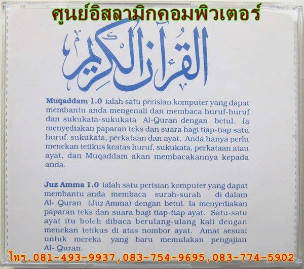 2. Al-Quran Juz : 30 เป็นโปรแกรมคอมพิวเตอร์ ช่วยสอนในการอ่านออกเสียงซูเราะฮฺ ต่างๆในยุซอัมมา อย่างถูกต้อง ระบบเสียงมีความชัดเจนมาก ด้วยเสียงของ ชัยค์ อัลหุซัยฟี่ ในโปรแกรมประกอบไปด้วยตัวบท คำอ่่าน คำแปล ในภาษามาลายู ( รูมี ) และ ในโปรแกรมสามารถเลือกฟังเสียงการอ่านแต่ละวรรคประโยคได้ หรือสั่งให้อ่านทุกตอนได้