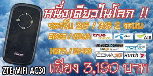 ด้วยการใช้งานที่ง่ายดาย การออกแบบที่ดูทนทาน เรียบง่าย แถมด้วยคุณสมบัติที่น่าสนใจเป็นอย่างยิ่ง เพราะ ZTE Mifi AC30 สามารถ รองรับ ความถี่ทั้งระบบ GSMและ CDMA ได้ซึ่งเป็น Mifi เพียงรุ่นเดียวที่สามารถทำได้ ท่านจึงสามารถเลือกใช้งานอินเตอร์เน็ตความเร็วสูง 3G ได้ทุกพื้นที่ที่มีการเปิดให้บริการจากหลากหลายค่าย ไม่ว่าจะเป็น CAT CDMA /EV-DO,TOT 3G/MVNO,AIS 3G รวมทั้งยังสามารถเชื่อมต่อผ่านระบบ EDGE (2G )ของ AIS,DTAC,TRUE ,CAT CDMA ได้อีกด้วย