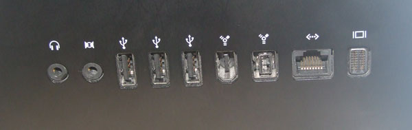 Three USB2.0 ports on iMac; two USB 2.0 ports on keyboard, One FireWire 400 and FireWire 800 port