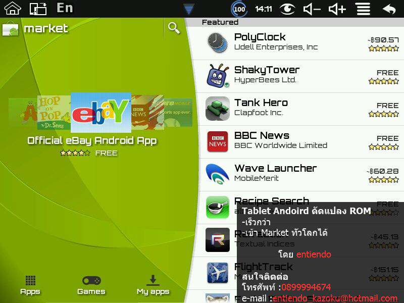 ขาย Tablet 8 นิ้ว Root แล้วสามารถลงโปรแกรมที่จำเป็นต้องรูปและเข้า Market ทั่วโลกได้ รวดเร็วกว่า ROM ที่ติดมากับเครื่องและไม่มีร้านไหนเหมือนแน่นอน! เหมาะสำหรับมือใหม่หัดเล่น ANDROID หรือใช้ในการศึกษาคร้าบ