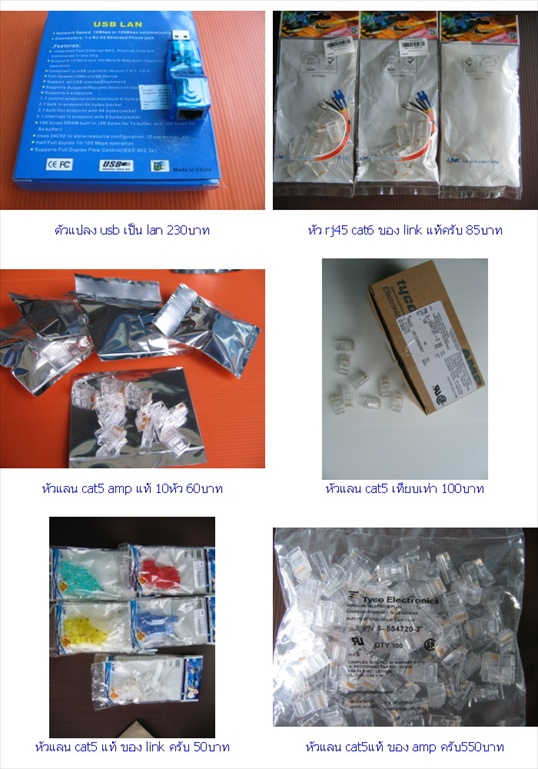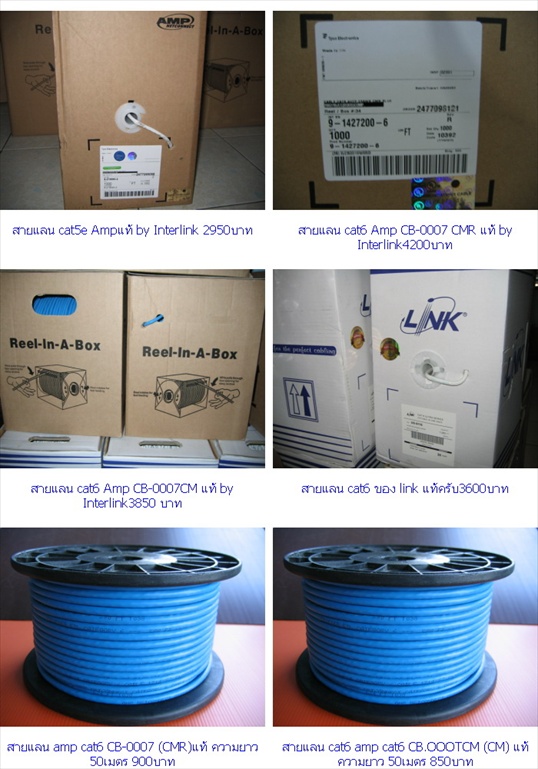 แวะเข้ามาชมสินค้ากันได้ครับ www.rrshop2home.com จัดส่งสินค้าทุกวัน (วันที่ไปรษณีย์เปิดทำการ) โทร 081-4418032,081-3986958 สั่งชิ้นเดียว เล็กใหญ่ เราส่งหมดครับ -วิธีทำสายแลน cat6 http://rrshop2home.com/rrshopboard/view.php?qID=22 - วิธีตรวจเช็กสายแลน amp ว่าเป็นของแท้หรือไม่ http://rrshop2home.com/rrshopboard/view.php?qID=25
