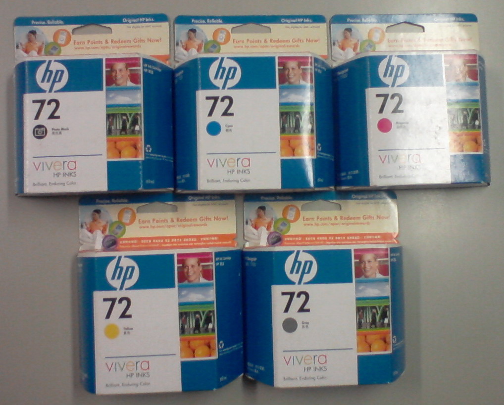 ขาย HP 72 สีละ 700 บาท C9397A BLACK C9398A CYAN C9399A MAGENTA C9400A YELLOW C9401A GRAY ใช้กับเครื่อง HP Designjet T610, T1100