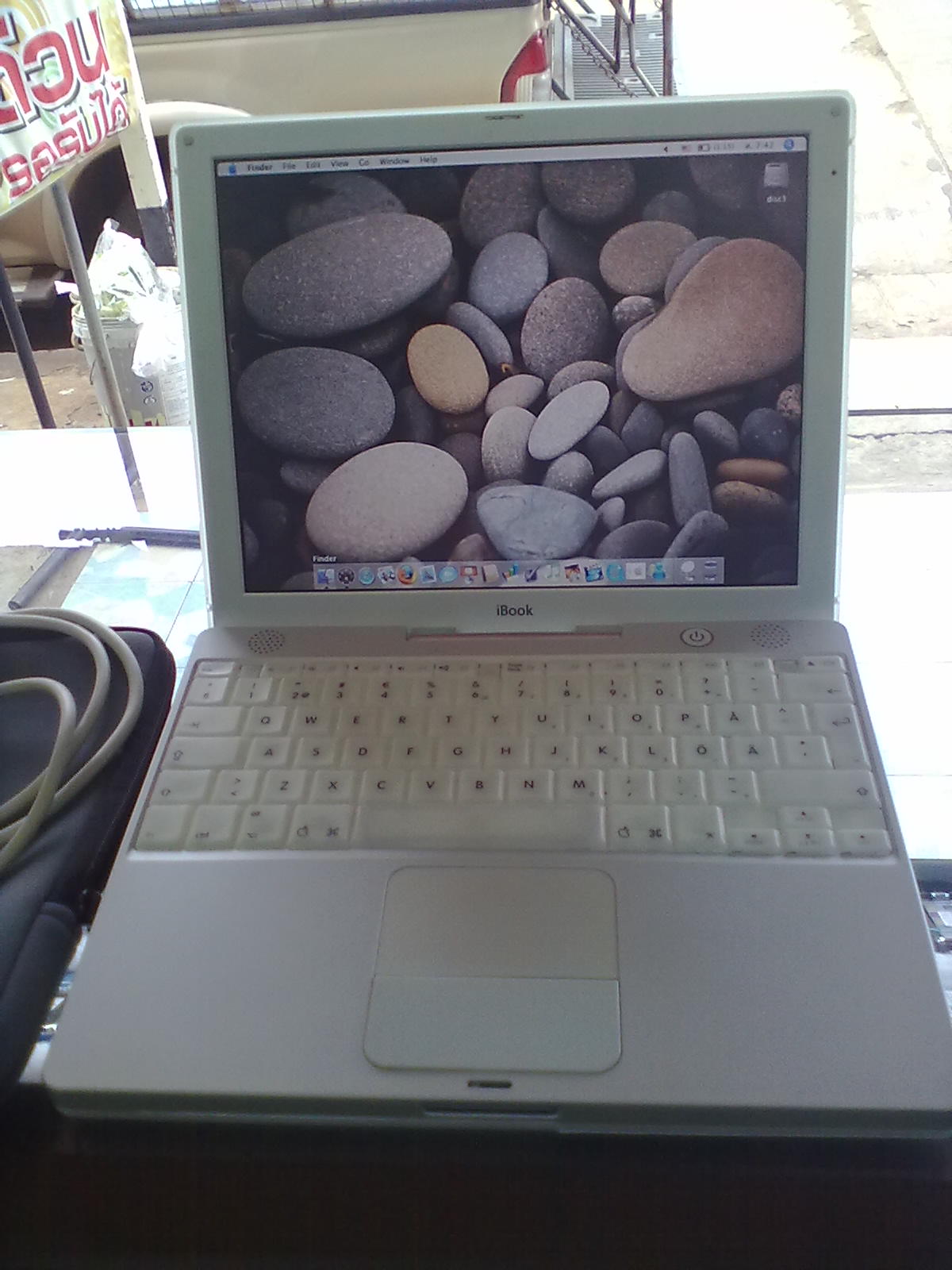 สภาพดีเยี่ยม ไม่มีรอยแตกร้าว ใด ๆ แฟนฝรั่งของน้า ให้เอามาใช้ แต่เค้าใช้ไม่เป็น และเราก็ใช้ไม่เป็น คือแทบจะไม่ได้ใช้เลย มีรอยนิดหน่อยตามสภาพการใช้งาน แต่ก็ไม่มาก แบตเก็บไฟได้ประมาณ 2 ชั่วโมง มีอแดปเตอร์พร้อม keyboard ไม่มีภาษาไทยเพราะมาจาก สวีเดน แต่ลองเล่น facebook แล้ว สามารถพิมพ์ไทยได้ และอ่านไทยได้ อาจต้องซื้อสติ้กเกอร์มาติดเอาถ้าอยากเห็นปุ่มพิมพ์ไทย เหมาะสำหรับผู้เดินทาง และชอบสะสมของเก่าเก็บอย่าง apple มันคลาสสิคดี ดูหนัง ฟังเพลง พิมพ์งานได้ เล่นเน็ตได้ ก็เหมือนกับ netbook ดี ๆ นี่แหละ แต่มันเป็น mac ซะด้วย ในอดีต มันเป็นเจ้าของราคาอันแสนแพง แต่ในวันนี้อะไรก็เปลี่ยนไป แต่ความเท่มันอยู่ที่ รูป apple บนพื้นสีขาว เวลากลางคืน มันจะส่องแสงเวลาเราเล่น ดูดีจริง ๆ ฮ่า ๆ อารัมภบทมาเยอะ มาดูสเปกกันดีกว่า spec ตามเครื่อง เป็น ibook power pc G3 cpu = 700 mhz ram = 640 mb bus 100 hdd = 20 gb osx = 10.4.11 tiger dvd = อ่าน dvd 9 และธรรมดาได้ ไรต์ dvd ไ่ม่ได้ อ่าน cd ได้ ลองไรต์ แล้ว ไม่ได้ ขึ้น failed เอาเป็นว่าไรต์ไม่ได้แล้วกัน wireless = ไม่มี แต่ต่อสายแลน ได้ มีโมเด็มในตัว ถ้าจะเล่น wifi ต้องซื้อ usb wireless มาใช้ ราคาประมาณ 600-700 บาท กล้อง = ไม่มี จอ = 12 นิ้ว ที่เสียบลำโพง = เทสแล้ว ใช้ได้ usb = ใช้ได้ trackpad = ซ้ายใช้ได้ดี แต่คลิกขวาไม่ค่อยไป แต่เวลาใช้ แทบจะไม่ได้คลิกขวาเลย เพราะไม่รู้จะคลิกทำไมเหมือนกัน แถมกระเป๋าหนังแท้ และเม้าท์ธรรมดา oker + ที่ชาร์จแท้ ขอขายที่ราคา 5,500 บาทแล้วกัน นะ เพราะสภาพมันยังใหม่อยู่เลย ติดต่อที่ เก่ง 0896707110