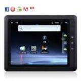 Model A818 CPU Samsung S5PV210(ARM Cortex TM-A8), 1GHz Operation System Android 2.3 RAM 512MB Nand Flash 4GB Shell Material Plastic shell Screen Size 8 Inch Display Resistive Screen Resolution 800 x 600px Visible Angle 135° Extend Card Support, up to 32GB Camera Yes, 2.0 Megapixels Gravity Sensor Yes, 360 Degree Multi-Touch No Flash Support Flash 10.2 Android Market Yes, support( App Planet, UK jailbreak version) Youtube Support 3D Game Support, SGX540 OpenGL-ES 1.1 and 2.0 and OpenVG 1.0 Video Support 720P HD video decoding play: MPEG1, MPEG2, WMV9, MPEG4-SP, ASF, DIVX, H.263, H.264, TS, FLV, AVI, RM,