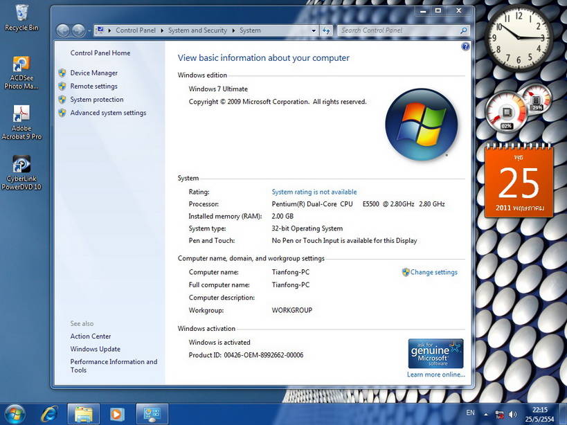 1. CPU: Intel E5500 Pentium Dual Core - 2.80GHz,2MB Cache,800MHz FSB,Socket LGA775 (ประกัน SYNNEX 3Y ) 1,600 B.