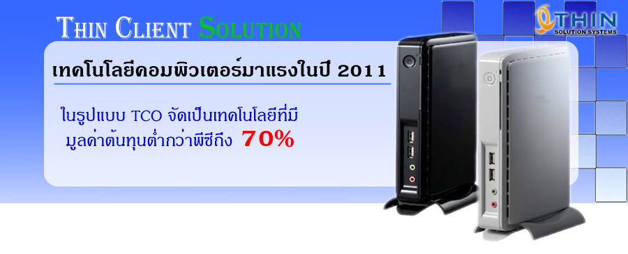 “Thin Client เป็นฮาร์ดแวร์คอมพิวเตอร์ขนาดเล็ก กินไฟน้อย มีซีพียู แรม และสโตเรจน์เหมือนเครื่อง คอมพิวเตอร์ทั่วไป ใช้โปรแกรมทุกประเภท เช่น เวิร์ด เอ็กเซล เพาว์เวอร์พอยด์ โปรแกรมบัญชี โปรแกรม บุคคลเป็นต้น จากเซิร์ฟเวอร์ โดยผู้ใช้เกือบจะไม่มีความรู้สึกแตกต่างจากการใช้เครื่องคอมพิวเตอร์เลยแม้ แต่น้อยเพิ่มเติม...........