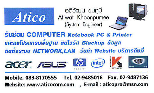 บริการ ซ่อมคอม ถึงบ้าน ซ่อมคอม ถึงบริษัท บริการ คอม รายเดือน รายปี บริการถึงที่ ลงโปรแกรม Windows PC & NOOTBOOK & PRINTER ล้างเครื่อง กำจัดไวรัส แก้ปัญหาต่างๆ เครื่องจอฟ้า เครื่องแฮ๊ง น๊อค เปิดไม่ติด รับทำ website ราคากันเองครับ สอบถาม โทร.083-817-0555 PIN BB แอดมาได้เลยครับ 223E0FBD http://www.aticocom.com