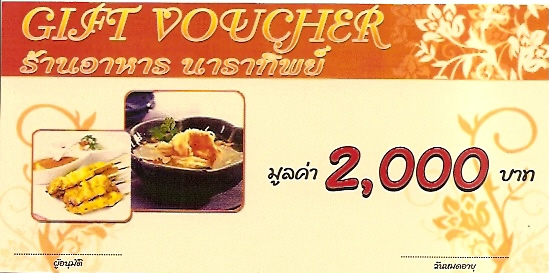 ขายบัตรทานอาหาร ร้านนาราทิพย์ ราคาใบละ 2,000 บาท ลดเหลือ 1,000 บาท ด่วน! มีจำนวนจำกัด สอบถามรายละเอียดเพิ่มเติม โทร. 089-8892148 www.kadmua.com