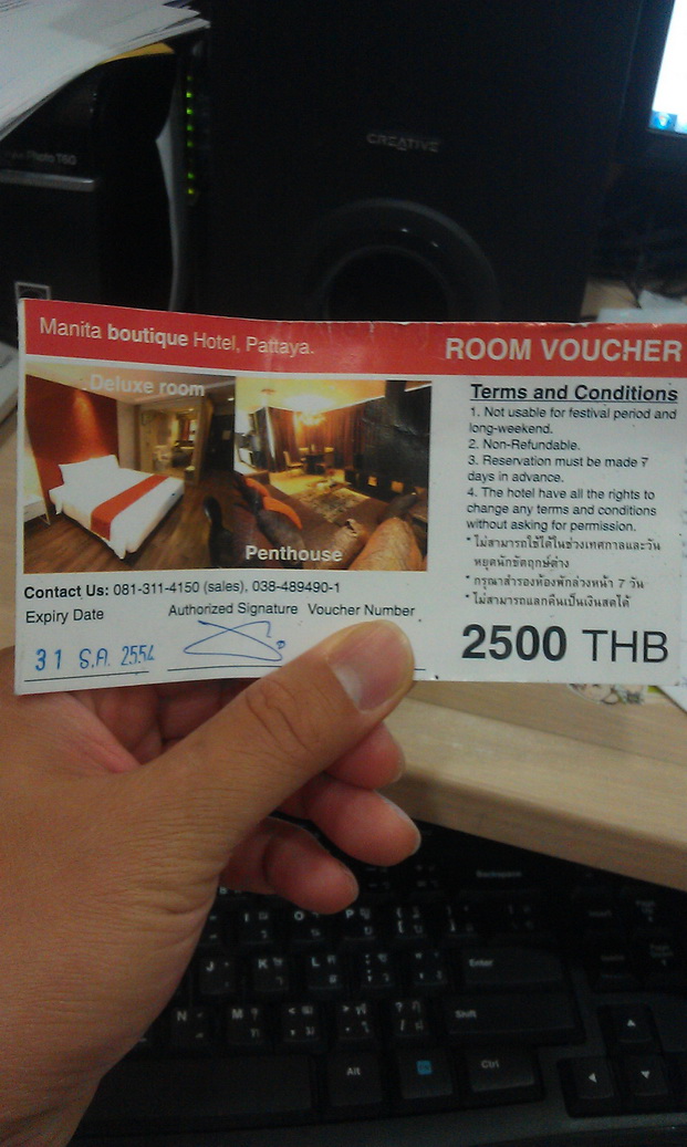 ขายตั๋วที่พักในพัทยาใต้ โรงแรม Manita boutique Hotel ราคาถูกมาก เพราะไม่ได้ไป เป็น Voucher ราคา 2,500 พักห้อง Deluxe ตั๋วหมดอายุ 31 ธค. 2554 ไม่มีเวลาไปใช้จึงขายในราคาถูกมาก สามารถโทรเช็คห้องพักก่อนได้ที่ 038-489-490-1